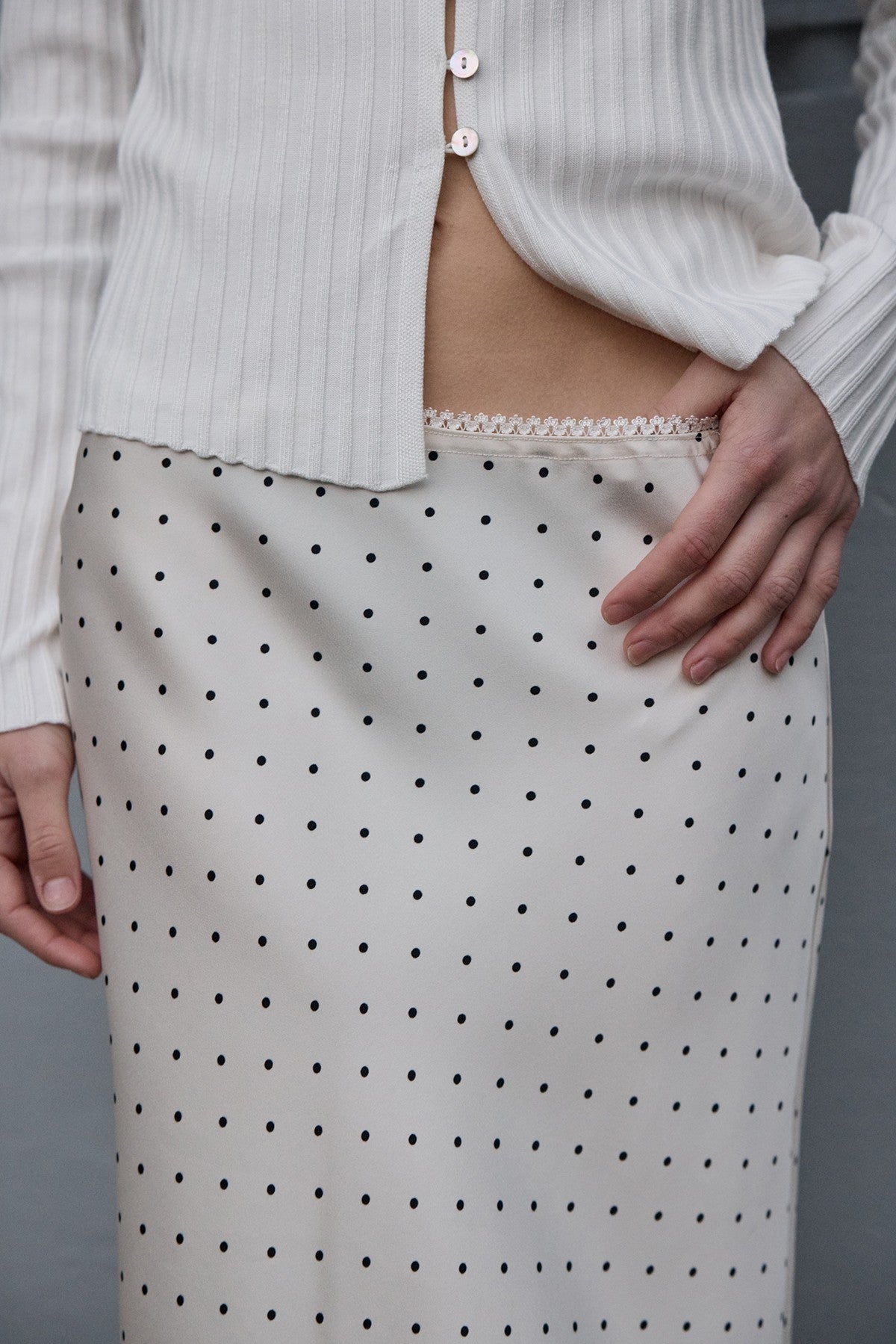 CREAM POKA DOT SATIN MIDI SKIRT