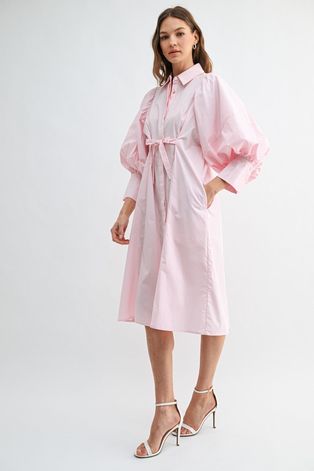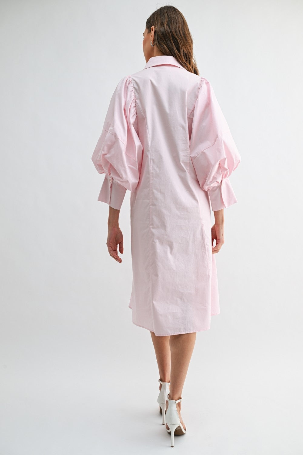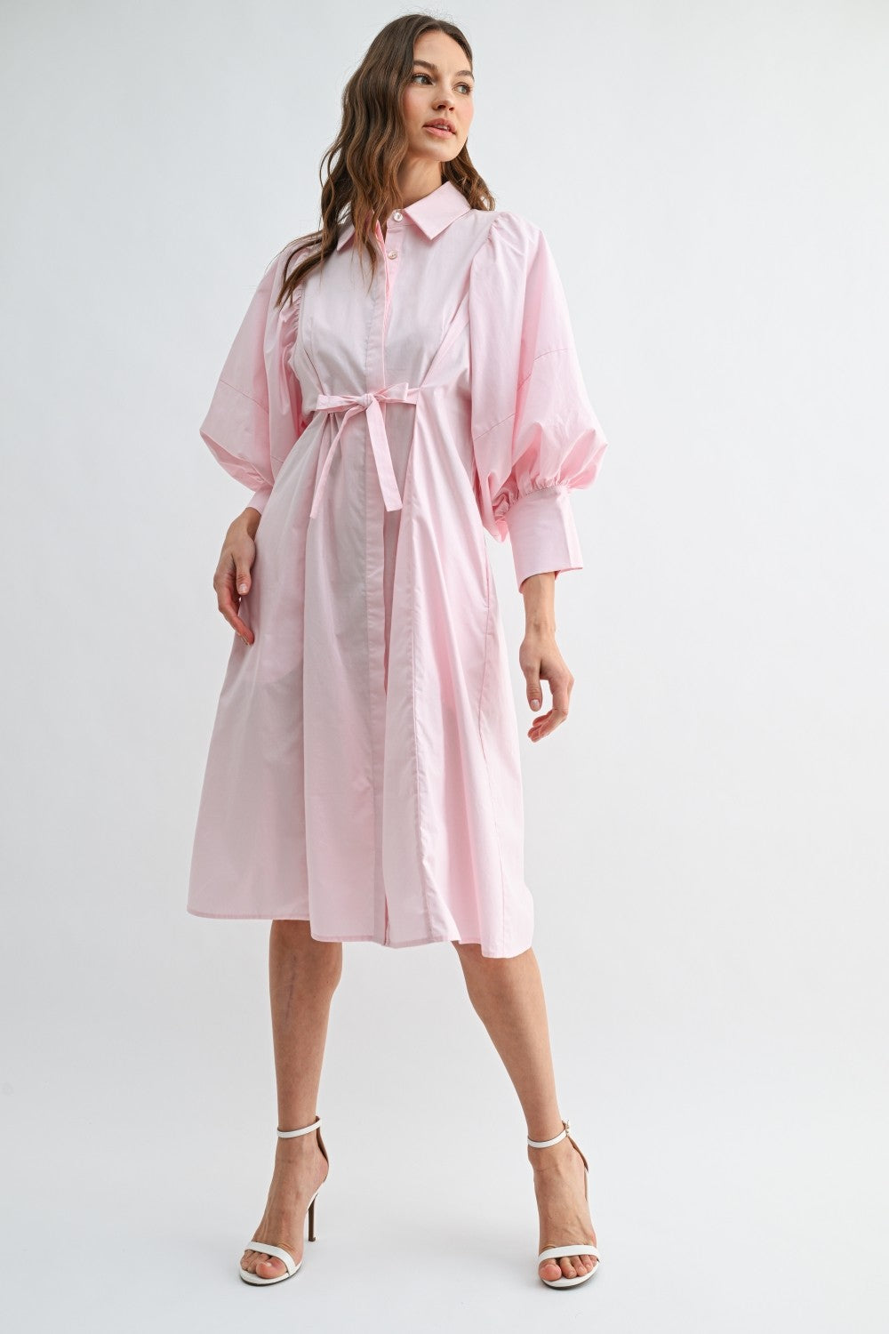 Pink Puff Sleeve Midi Shirt Dress